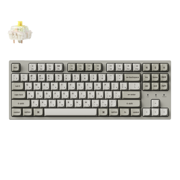 Классическая TKL (80%) механическая клавиатура Keychron C1 Pro 8K - проводное подключение, частота опроса 8K, 87 клавиш, ANSI, с поддержкой QMK/VIA, корпус из ABS пластика, Tray Mount, цвет Retro, переключатели Keychron Super Banana, горячая замена переключателей, PBT-кейкапы, OSA профиль, EN / RU - двойное литье (Double Shot), RGB подсветка (южные светодиоды), шумоизоляция (несколько слоев звукопоглощающей пены и слой силикона), размеры без клавиш 357 x 131 x (20 спереди – 29 сзади) мм, вес 830 г.