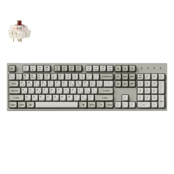 Полноразмерная (100%) механическая клавиатура Keychron C2 Pro 8K - проводное подключение, частота опроса 8K, 104 клавиши, ANSI, с поддержкой QMK/VIA, корпус из ABS пластика, Tray Mount, цвет Retro, переключатели Keychron Super Red, горячая замена переключателей, PBT-кейкапы, OSA профиль, EN / RU - двойное литье (Double Shot), RGB подсветка (южные светодиоды), шумоизоляция (несколько слоев звукопоглощающей пены и слой силикона), размеры без клавиш 436 x 130 x (20 спереди – 28 сзади) мм, вес 975 г.