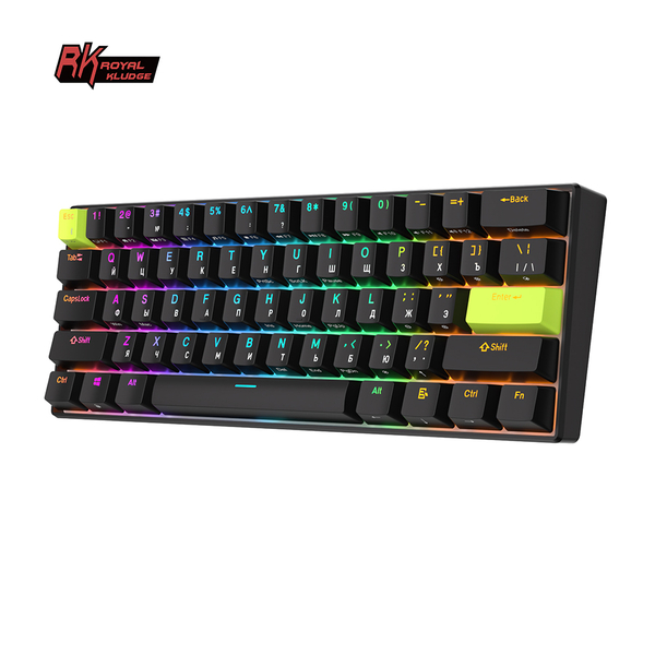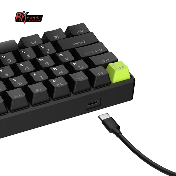 Компактная (60%) механическая (магнитная) клавиатура Royal Kludge C61 - проводное подключение (съёмный USB-C кабель), частота опроса 8000 Гц, 61 клавиша, профиль Cherry, цвет Black Green, магнитные переключатели RK Mint, 6 вариантов настройки точки активации, низкая задержка 0,125 мс, Top Mount; EN - двойное литье (Double Shot), RU - лазерная гравировка,