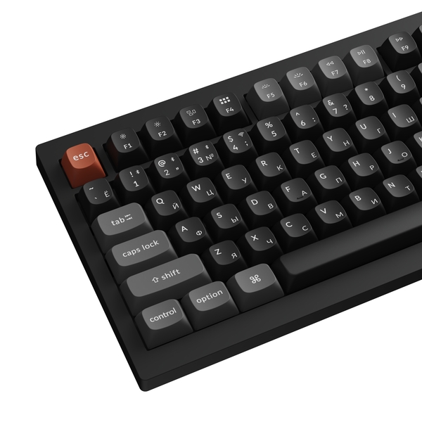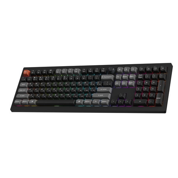 Полноразмерная (100%) механическая клавиатура Keychron V6 Ultra - 3 типа подключения (Bluetooth; радиоканал 2,4 ГГц; провод), 108 клавиш, частота опроса 8000 Гц, ANSI, поддержка ZMK, корпус из ABS пластика, Gasket Mount, цвет Black, переключатели Keychron Silk POM Brown, горячая замена переключателей, PBT-кейкапы, OSA профиль, EN/RU - двойное литье (Double Shot), RGB подсветка, южные светодиоды, шумоизоляция, стабилизаторы с винтовым креплением, вращающаяся ручка, аккумулятор 4000 mAh (до 660 часов работы при выключенной подсветке), размеры без клавиш 447,9 x 149 x (24,7 спереди – 31,2 сзади) мм, вес 1130 г.