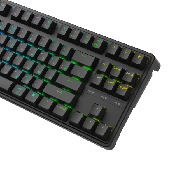 гравировка, RGB подсветка (северные светодиоды), шумоизоляция (несколько слоев звукопоглощающей пены и слой силикона), размеры без клавиш 365 x 138 x (21 спереди – 30 сзади) мм, вес 830 г.