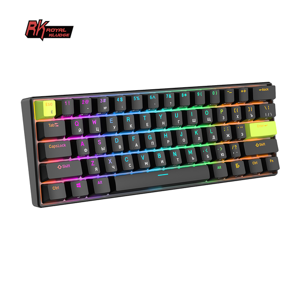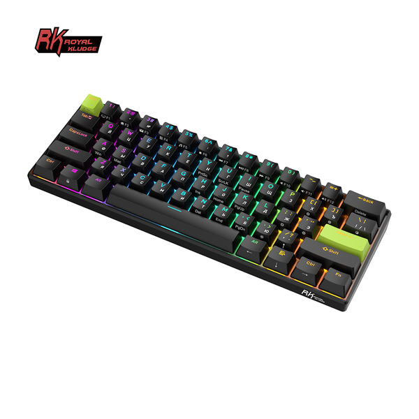 Компактная (60%) механическая (магнитная) клавиатура Royal Kludge C61 - проводное подключение (съёмный USB-C кабель), частота опроса 8000 Гц, 61 клавиша, профиль Cherry, цвет Black Green, магнитные переключатели RK Mint, 6 вариантов настройки точки активации, низкая задержка 0,125 мс, Top Mount; EN - двойное литье (Double Shot), RU - лазерная гравировка,