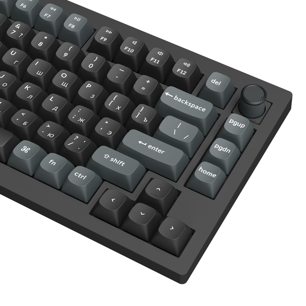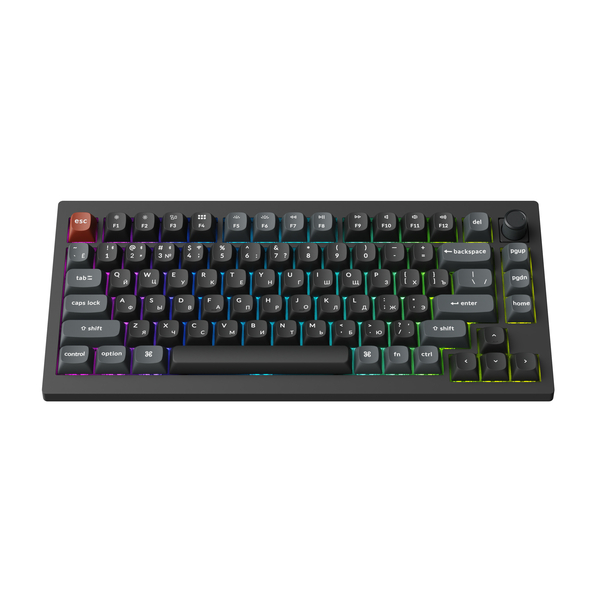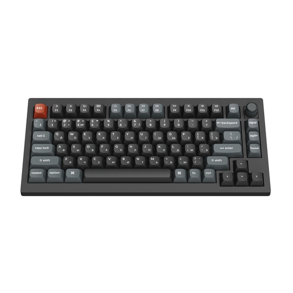 Компактная (75%) механическая клавиатура Keychron V1 Ultra - 3 типа подключения (Bluetooth; радиоканал 2,4 ГГц; провод), 81 клавиша, частота опроса 8000 Гц, ANSI, поддержка ZMK, корпус из ABS пластика, Gasket Mount, цвет Black, переключатели Keychron Silk POM Brown, горячая замена переключателей, PBT-кейкапы, OSA профиль, EN/RU - двойное литье (Double Shot), RGB подсветка, южные светодиоды, шумоизоляция, стабилизаторы с винтовым креплением, вращающаяся ручка, аккумулятор 4000 mAh (до 660 часов работы при выключенной подсветке), размеры без клавиш 328,5 x 148,7 x (21,5 спереди – 29,4 сзади) мм, вес 770 г.