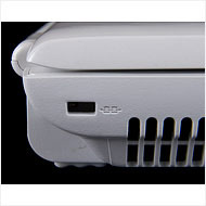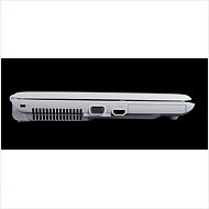 Слева у задней кромки Samsung Q310 находится замок Kensington, чуть ближе и ниже расположена решётка системы охлаждения, через которую горячий воздух выбрасывается из корпуса. Далее по центру левой стороны ноутбука расположен аналоговый разъём D-SUB, а чуть ближе к пользователю находится HDMI, через который можно подключить современный монитор или, например, плазменную или жидкокристаллическую панель. Рядом с пользователем есть заглушка-салазки, в которой находится жёсткий диск. То есть накопитель можно извлечь, например, в целях обеспечения безопасности данных или для замены.