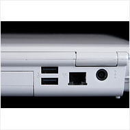 Сзади Samsung Q310 все функциональные элементы размещены с одной стороны, слева от пользователя. Вся остальная часть задней панели представляет собой нишу для батареи. После её установки получается ровная сплошная поверхность. Самым крайним элементом, у левой боковой стенки, является гнездо питания. Далее можно увидеть гнездо RJ-45 для подключения к сети Ethernet и два порта USB друг над другом. Последние расположены очень тесно, а потому не все USB-устройства уживутся здесь рядом.