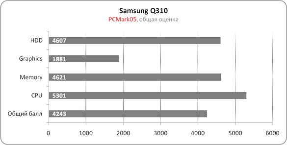 Внутри Samsung Q310 довольно производительные компоненты. Будет интересно посмотреть, на что этот "малыш" способен. Для этого нами были проведены общесистемные тесты PCMark05 и PCMark Vantage. Играть на ноутбуке с интегрированным графическим ядром вряд ли целесообразно. Дабы сомнений не было, мы провели тесты и в пакетах 3DMark05 и 3DMark06. Ну и напоследок представим результаты синтетических замеров производительности жёсткого диска.