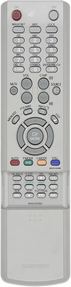 Пульт имеет дизайн, традиционный для пультов от видеотехники Samsung. В руке он лежит удобно. Так же удобно пользоваться блоком курсорных кнопок. Часть кнопок убрана под сдвигающуюся крышечку. Судя по наличию незадействованных кнопок, пульт универсальный, а не предназначенный для использования только с данной моделью ЖК-панели.