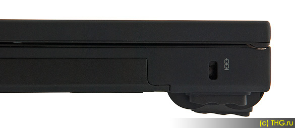 Справа под рукой пользователя расположились порт USB и аудио разъёмы. Далее резиновой заглушкой в корпусе прикрыто отверстие для монтажа розетки RJ-11 для модема, однако в нашей модели модем отсутствовал. У задней кромки можно обнаружить отверстие для крепежа замка Kensington.