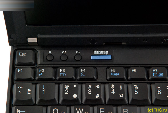 Над клавиатурой Lenovo Thinkpad x200s есть ряд дополнительных клавиш для регулирования громкости. Они выполнены в виде скруглённых чёрных кнопок. Правее есть прямоугольная голубая клавиша ThinkVantage, с помощью которой в начале загрузки можно вызвать систему восстановления, ну а в Windows - центр управления утилитами Lenovo. Ближе к центру расположена кнопка включения/выключения, так же выполненная в виде "таблетки" с белым пятном сверху.