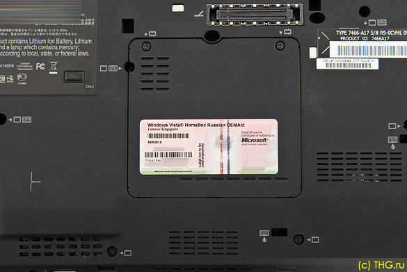 Днище Lenovo Thinkpad x200s имеет "сложный" внешний вид. Вентиляционные отверстия распределены по всей поверхности. По центру присутствует отсек для доступа к заменяемым компонентам ноутбука. На его крышечку приклеен лицензионный стикер Microsoft. Также есть и служебные наклейки Lenovo. Чуть дальше от центра к задней кромке ноутбука находится разъём для док-станции или репликатора портов. Заглушки никакой нет, поэтому в него, вероятно, со временем, будет забиваться пыль.