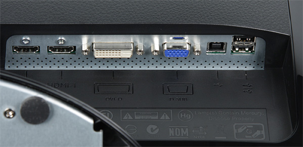 Разъем питания и интерфейсные разъемы расположены в нише сзади и ориентированы вниз. Сзади в нижнем углу можно обнаружить разъем для замка Кенсингтона. Основание подставки снизу усилено стальной площадкой. Четыре резиновые ножки-таблетки надежно фиксируют монитор на столе, а относительно большая площадь основания обеспечивает монитору хорошую устойчивость. Единственный шарнир позволяет немного наклонять блок экрана вперед и больше — назад.