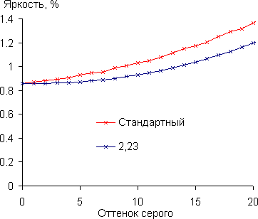 Аппроксимация полученной гамма-кривой дала значение показателя 2,23, что близко к стандартному значению 2,2. При этом реальная гамма-кривая хорошо совпадает со степенной функцией (при выборе профиля Стандартный):