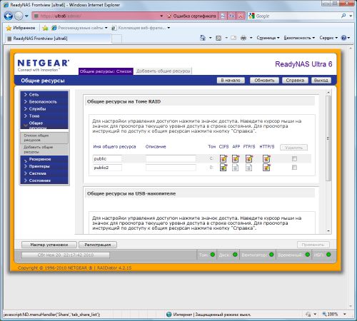 Еще одной особенностью ReadyNAS является доступ к интерфейсу настройки не просто по IP-адресу/имени хоста, а с добавлением суффикса /admin/. Кроме того, происходит автоматическая переадресация на HTTPS. Собственный сертификат SSL загрузить в устройство нельзя. Для домашнего применения это, конечно, не критично. Интерфейс локализован, язык определяется по настройкам браузера. Для начинающих пользователей есть режим помощника.