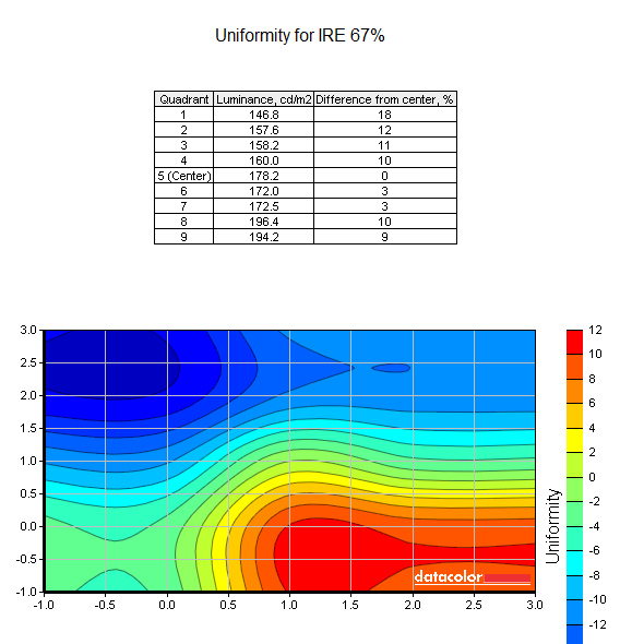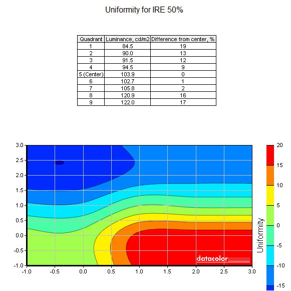 Равномерность подсветки экрана также оценивалась в режиме пользовательских установок с максимальным уровнем яркости базовых цветов и максимальной яркостью. Таблицы и иллюстрации ниже показывают отклонение яркости различных областей экрана от центральной точки.