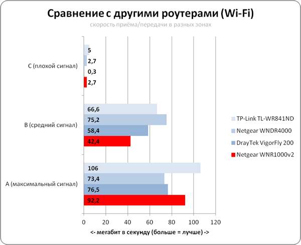 Результаты тестов показывают, что Netgear WNR1000 демонстрирует хорошую производительность во всех сценариях: скорость маршрутизации NAT, а также с использованием PPTP, происходит на максимальной скорости соединения порта WAN. Практическая производительность Wi-Fi тоже неплохая - до 94 мегабит на приёме, до 88 на передаче [в идеальных условиях]. Работа с беспроводным клиентом в зоне слабого уровня сигнала удовлетворительная - средняя цифра 2.7 мегабит получается из 4,6 Мбит/с на приёме, 1,4 Мбит/с на передаче данных и 1,8 Мбит в дуплексе. Стоит отметить, что в тесте в зоне C роутер заметно опередил роутер DrayTek VigorFly 200, использованный нами для сравнения, и оснащённый двумя массивными внешними антеннами. А в среднем скоростные показатели при слабом уровне сигнала оказались сопоставимыми с тем, что продемонстрировал Netgear WNDR4000. Но конечно, средние 2.7 Мбит/с в зоне слабого сигнала цифра, в абсолютных показателях, очень низкая. Для покрытия интернетом больших частных многоэтажных домов придётся использовать несколько таких роутеров.