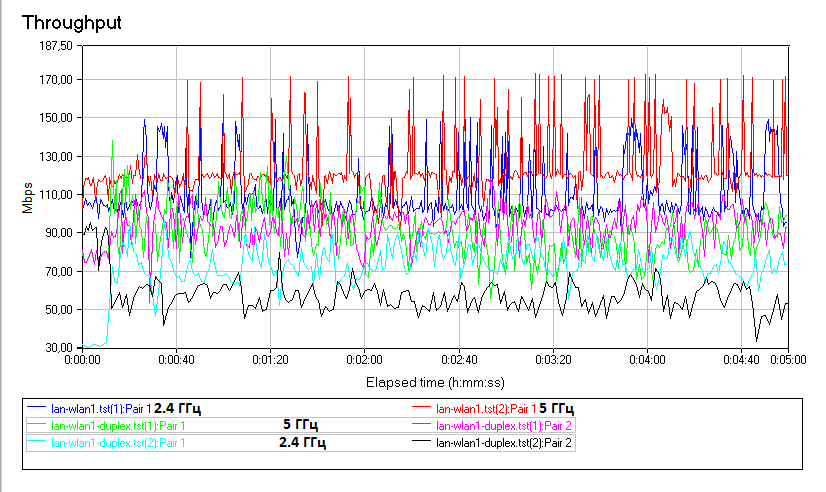 Для тестирования использовались утилиты Ixia IxChariot 6.7 с профилем High Performance Throughput, iperf 1.7.0 и простое копирование файлов по сети. Для обоих диапазонов Wi-Fi было выставлено шифрование WPA2-AES, вручную выбраны каналы 1(+5) и 44(+48), а остальные настройки оставлены по умолчанию.