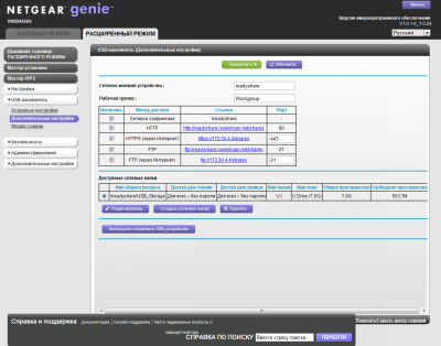Маршрутизатор может работать с ФС FAT13/32, NTFS и EXT2/3. Если на накопителе имеется несколько разделов, то они будут подмонтированы как отдельные сетевые папки. Впрочем, можно самостоятельно выбрать папки на диске, которые станут общедоступными. Доступ к данным осуществляется через HTTP, FTP или SMB. Извне общие ресурсы доступны только по HTTPS или FTP. Системы распределения прав как таковой, в общем-то, и нет. Можно лишь защитить доступ на чтение и/или запись администраторским логином и паролем к веб-интерфейсу роутера. По умолчанию при подключении накопителя он сразу же становится доступным в локальной сети без ограничений доступа.