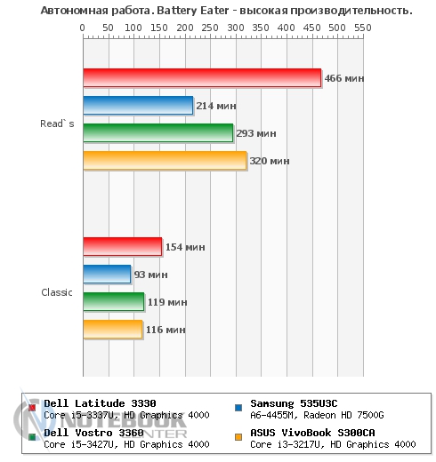 Что касается сравнения результатов в «Высокой производительности», то здесь Latitude 3330 также на высоте. Например, он опережает в режиме «Read’s» Samsung 535U3C более чем в два раза, да и в «Classic» проработает дольше остальных конкурентов.
