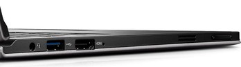 По периметру нижней части корпуса расположились разъёмы, которых немного, но среди них есть самые нужные. На левом торце — 3,5-милиметровое гнездо для подключения наушников, USB ревизии 3.0 и HDMI, как ни удивительно для такого тонкого корпуса, полноформатный. Также присутствует сдвоенная узкая кнопка для регулировки громкости, особенно удобная в планшетном варианте. На правом — USB ревизии 2.0 и разъём для подключения блока питания, по своей форме очень на него похожий, но с единственным круглым штырьком посередине. Чтобы не путать их друг с другом, разъём питания выкрашен в жёлтый цвет. Между этими двумя разъёмами, почти совсем незаметный, притаился слот для карт памяти «два в одном» (под этим загадочным термином производитель подразумевает форматы SD и MMC). Там же находится кнопка блокировки автоматического поворота экрана.