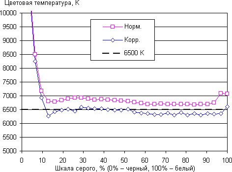 Цветопередача даже при выборе лучшего из предустановленных вариантов несколько отличается от стандартной, поэтому мы попытались вручную скорректировать цвета, регулируя усиление трех основных цветов. Графики ниже показывают цветовую температуру на различных участках шкалы серого и отклонение от спектра абсолютно черного тела (параметр ΔE) в случае профиля Норм. в изначальном варианте и после ручной коррекции: