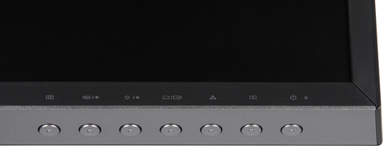 Первый пункт — вызов основного меню, последний — выключение монитора, остальные предоставляют быстрый доступ к нескольким функциям. Значки располагаются над кнопками, что упрощает управление и навигацию. Заявлено, что при перевороте экрана в портретную ориентацию, меню также переворачивается. Меню относительно крупное.
