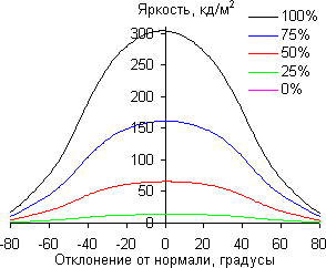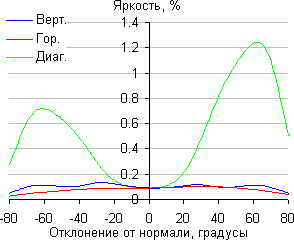Отметим плавное уменьшение яркости при отклонении от перпендикуляра к экрану в горизонтальном направлении, при этом графики не пересекаются во всем диапазоне измеряемых углов. Быстрее падает яркость при отклонении в вертикальном направлении. При отклонении в диагональном направлении поведение яркости оттенков имеет промежуточный характер между вертикальным и горизонтальным направлениями, за исключением яркости черного поля, которая начинает резко возрастать уже при 20-30° отклонения от перпендикуляра к экрану. Если сидеть от экрана на расстоянии 50-60 см, то черное поле по углам будет заметно светлее и с легким цветовым оттенком. Контрастность в диапазоне углов ±82° приближается к отметке 10:1 только при отклонении по диагонали, и при отклонении к одному углу (из двух протестированных) опускается ниже после отметки 74°.