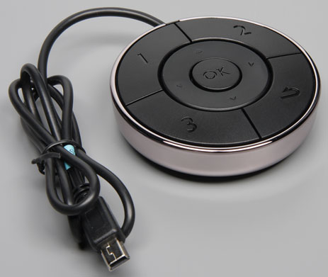 Предпоследний значок — вызов основного меню, последний — выход из меню. Далее при навигации по меню над кнопками также выводятся иконки-подсказки по текущим функциям. При работе с монитором удобно использовать внешний проводной контроллер. Он имеет круглую форму, его корпус изготовлен из пластика с зеркально-гладкой хромированной и блестящей поверхностью. Сами кнопки — из черного матового пластика.