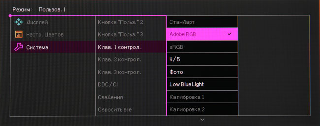 Два профиля отведены для хранения пользовательских настроек, и еще два — для профилей коррекции, полученных при аппаратной калибровке с помощью комплектного ПО. Их в меню можно только выбрать, да и то если они уже были созданы.