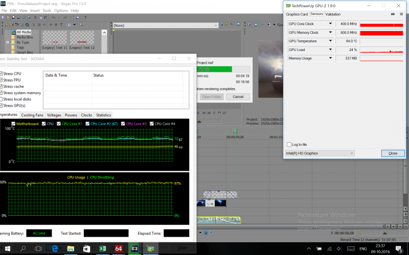 Но поскольку такая нагрузка очень далека от реальной, то мы, как и всегда, провели стандартный тест реальным приложением по работе с видео — Sony Vegas Pro 13, в котором был произведён рендеринг короткого видеоролика. На этот раз был выбран кодек попроще и разрешение Full HD (вместо 4К).